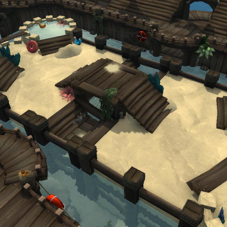 Become king of the castle in our team-based watergun battle! Players will explore the sand-tastical "Neptulon's Crown" arena while jumping, balancing, and dousing down the competition!